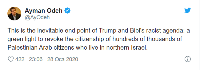 Odeh, Twitter hesabından yaptığı paylaşımda, “Sahip olduğumuz tüm araçlarla bu ırkçılığa karşı mücadele edeceğiz. Demokrasi ve barışa inanan Arap ve Yahudi olsun her bir vatandaş bu tehlikeli plana karşı koymalı” dedi.