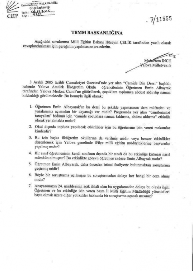 CHP'li İnce'nin soru önergesinde camiye götürüp "abdest ve namaz öğretme" etkinliği düzenleyen öğretmen Albayrak'a yönelik soru önergesinde dikkat çeken ifadeler yer aldı. CHP'li İnce öğrencilerin camiye götürülüp "namaz kılma ve abdest alma" etkinliğini irticai faaliyet olarak değerlendirdi.