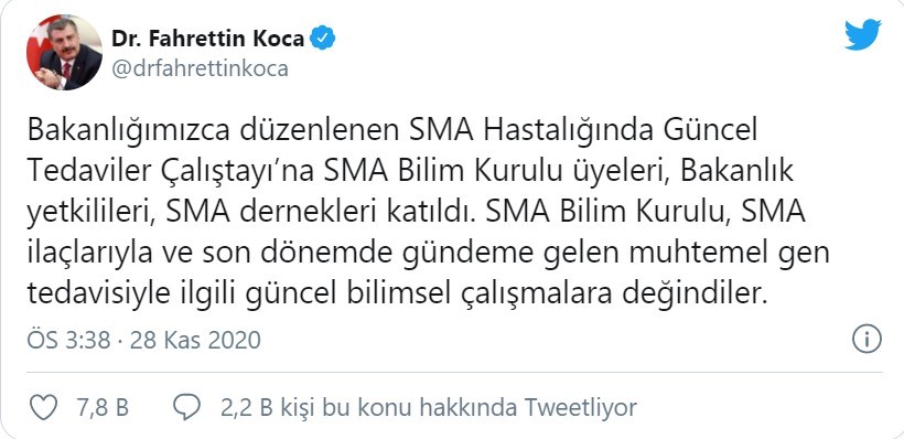Bakan Koca, Twitter hesabından yaptığı açıklamada, Sağlık Bakanlığı'nca düzenlenen 'SMA Hastalığında Güncel Tedaviler Çalıştayı'na SMA Bilim Kurulu üyeleri, bakanlık yetkilileri, SMA derneklerinin katıldığını belirtti. Koca, "SMA Bilim Kurulu, SMA ilaçlarıyla ve son dönemde gündeme gelen muhtemel gen tedavisiyle ilgili güncel bilimsel çalışmalara değindiler. SMA Bilim Kurulu, hastalığın tedavisi olmadığı, 2 yaşına kadar gen tedavisi almazsa öleceği hakkındaki iddiaların asılsız olduğunu belirtti. Başvuru süreci tamamlanan SMA hastaları etkinliği ve yan etkileri bilinen, ülkemizde başarı ile uygulanan tedaviden halen faydalanmaktadır. Gen tedavisi uygulama prosedürünün bir parçası olarak en az 1 ay süreyle bağışıklık sisteminin baskılanması gerekmekte, özellikle kilosu yüksek olan bazı hastalarda bu süreç 1 yıla kadar uzayabilmektedir. SMA Bilim Kurulu, her ay toplanıyor, STK'lar ve aileler bilgilendiriliyor" ifadelerini kullandı.