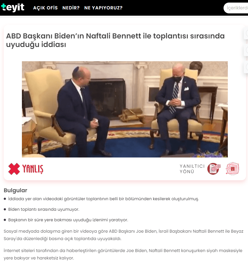 Gafları ve sağlık sorunları nedeniyle koltuğunu Başkan Yardımcısı Kamal Harris'e devredeceği konuşulan 78 yaşındaki ABD Başkanı Joe Biden, son olarak İsrail Başbakanı Naftali Bennett ile kameralar karşısındaki görüşmesinde uyuyakaldığı iddia edildi. Teyit.org ise, uyuyakalma değil, kısa süreli yere bakma olduğunu savundu.