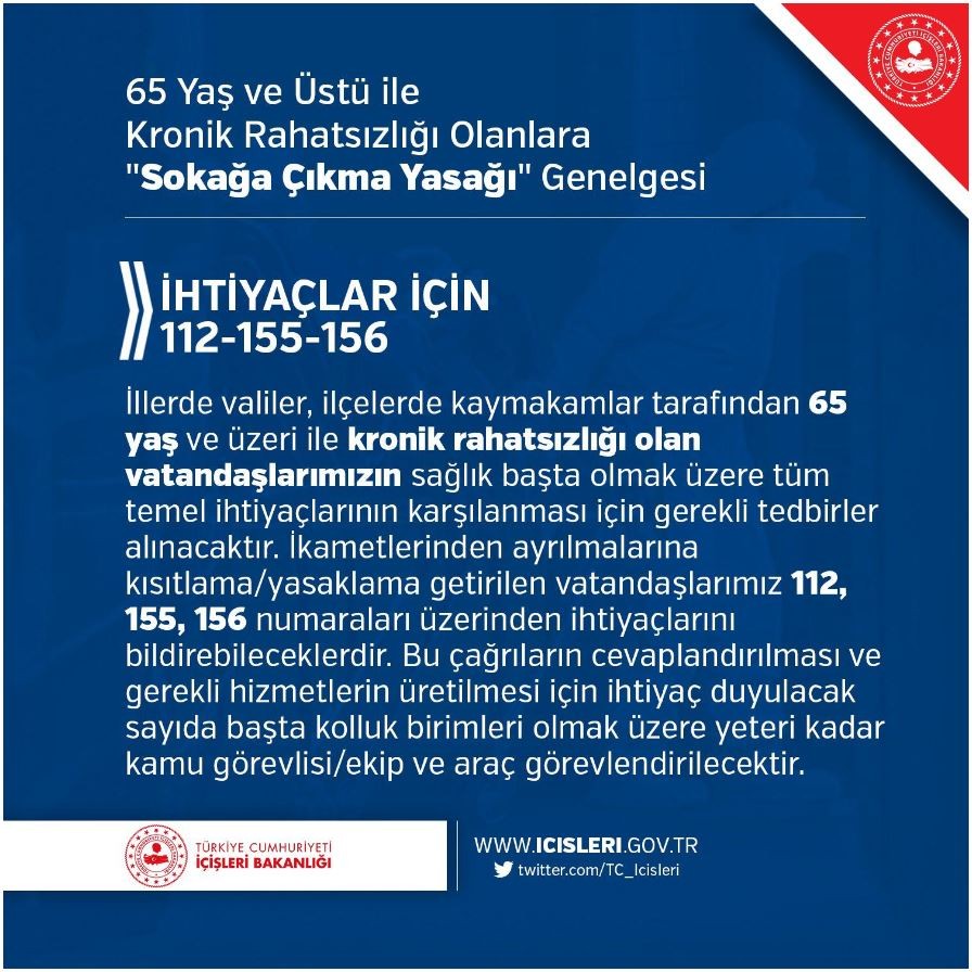 65 yaş üzeri ve kronik hastalığı olan kişilerin sokağa çıkması yasaklandı. Bildiri her şehir için uygulancaktır. 155 - 156 - 112 numaralarını arayarak yaşlıları ihbar edebilir, herkes için önlem almış olabilirsiniz.