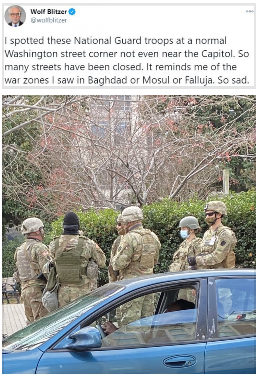 Blitzer, "Bu Ulusal Muhafız birliklerini, Kongre binası yakınında bile olmayan bir Washington sokağında gördüm." diye yazdı.