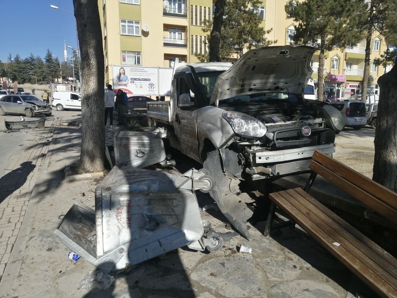 Isparta'nın Yalvaç ilçesinde servis kamyoneti ile otomobilin kavşakta çarpışması sonucu 1 kişi yaralandı. Kamyonetin kaldırımda bulunan oturma grupları ve ardından çöp kovalarına çarparak durabildiği kazada ortalık savaş alanına döndü.
