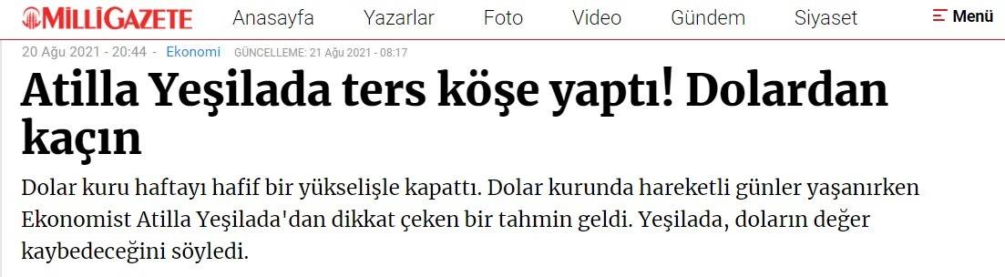 Pandemi ve dolar saldırılarına göğüs geren Cumhurbaşkanı Erdoğan'a düşmanlığının olmadığını iddia eden Atilla Yeşilada, "Erdoğan veya AKP'ye karşı hiçbir şahsi düşmanlığım yok. Ama kendi adıma çektiğim son Youtube videosunda sorunumu anlattım. Burası gulu gulu ekonomisi oldu. Burada ekonomi falan yok artık. Bir sabah kalkıyor birisi, o sabah nasıl hissediyorsa öyle emrediyor." ifadesinde bulundu.