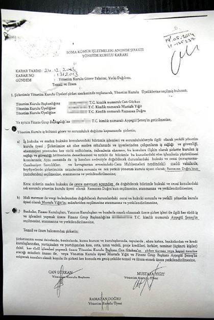 Can Gürkan ile Ramazan Doğru'nun, adliye koridorlarında birbirlerini suçlamalarına neden olan Soma Kömür İşletmeli A.Ş.'nin 24 Aralık 2013 tarihinde İstanbul'daki merkezinde yapılan yönetim kurulu toplantısına ait belge de ortaya çıktı. Can Gürkan, Mustafa Yiğit ve Ramazan Doğru'ya ait imzaların bulunduğu belgede, şirkete ait maden sahalarında ve işyerlerinde, iş sağlığı ile güvenliğinden ayrıca bu önlemleri alması gereken kişilerin denetiminden, adli soruşturmalar da dahil olmak üzere tek sorumlunun Ramazan Doğru olduğu yer aldı. Aynı belgede mali ve diğer finans konularıyla ilgili sorumlulukların ise, başka yönetim kurulu üyelerine verildiği yer aldı.