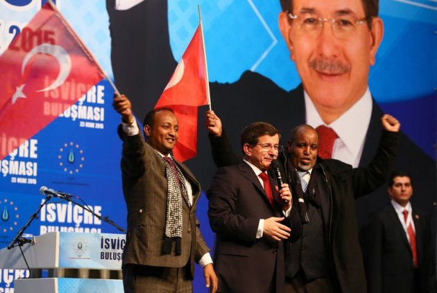 Bu sırada Beşir ve Abdülaziz isimli iki Somali vatandaşı sahneye Davutoğlu’nun yanına gelerek kendisiyle tokalaştı. Davutoğlu’nu öpen Somali vatandaşları sahnede Türk bayrağı salladılar.