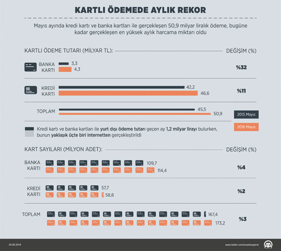 Banka kartları ve kredi kartları ile mayıs ayında toplam 50,9 milyar TL'lik ödeme yapıldı. Bu tutarın 46,6 milyar TL’sinde kredi kartları, 4,3 milyar TL'sinde banka kartları kullanıldı. Önceki yılın aynı dönemine göre büyüme oranı banka kartı ile ödemelerde yüzde 32, kredi kartı ile ödemelerde yüzde 11 seviyesinde gerçekleşti. Mayıs ayındaki 50,9 milyar liralık kartlı ödeme, bugüne kadar görülen en yüksek aylık tutar oldu.