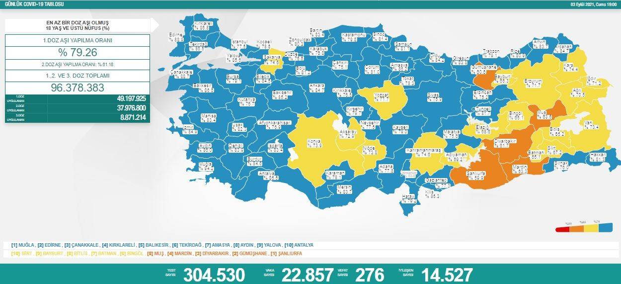 Sağlık Bakanlığı'nın 3 Eylül koronavirüs verilerine göre; Türkiye'de son 24 saatte 22 bin 857 kişinin testi pozitif çıktı, 276 kişi hayatını kaybetti.