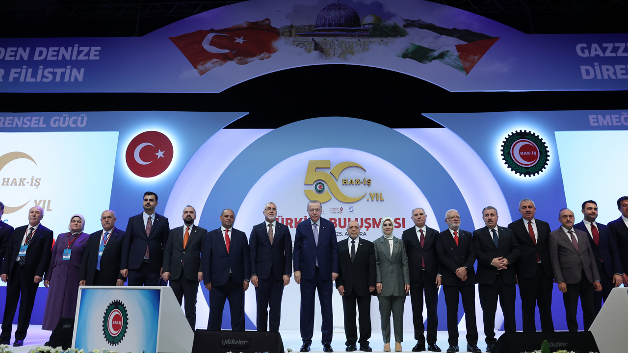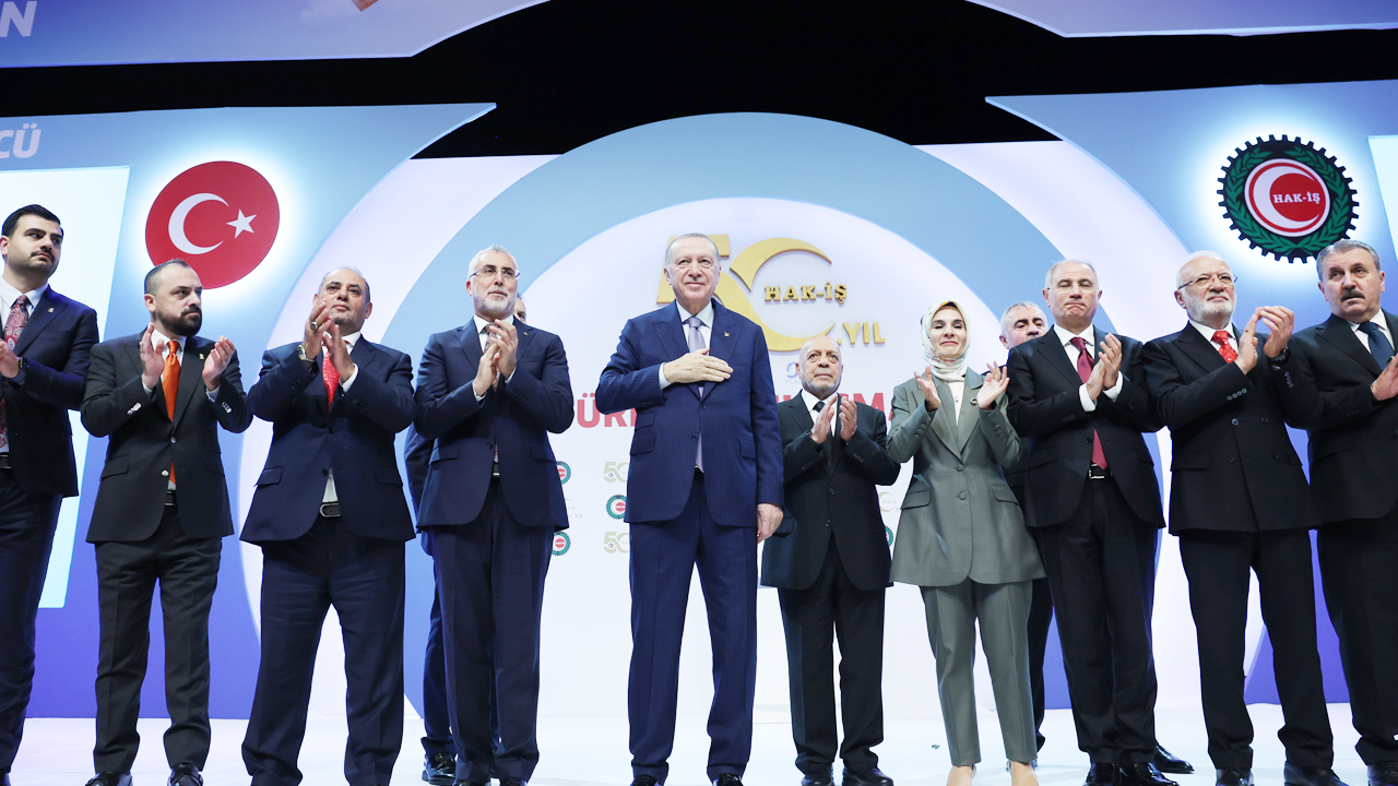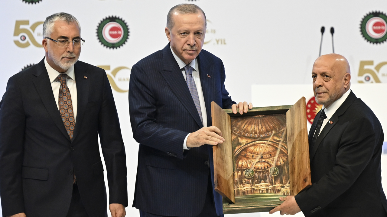 HAK-İŞ Konfederasyonu’nun 50. Kuruluş Yıl Dönümü Programı’nda konuşan Cumhurbaşkanı Erdoğan, "Hepimizi sıkıntıya sokan hayat pahalılığı meselesini mutlaka çözeceğiz" mesajını verdi. HAK-İŞ’in yarım asırlık örnek yolculuğunda darbecilerle, vesayetçilerle, terör örgütleriyle, para babalarıyla değil, daima milletle, Türk işçisiyle omuz omuza yürüdüğünün altına çizen Cumhurbaşkanı Erdoğan “Bu mücadeleyi birlikte verdik. Bir sağdan bir soldan gençlerin asıldığı 12 Eylül’ü birlikte aştık. Beşli çetelerin milletin ensesinde boza pişirdiği 28 Şubat’ı birlikte aştık. Darbe çığırtkanlığının yapıldığı günleri birlikte aştık. Hükümetin devrilmeye çalışıldığı Gezi olaylarını birlikte aştık. 17-25 Aralık’tan 15 Temmuz ihanetine; millî iradeye yönelik girişimleri birlikte aştık. Türkiye’ye kurulan tuzakların hepsini, Allah’a hamdolsun boşa çıkardık” dedi.
