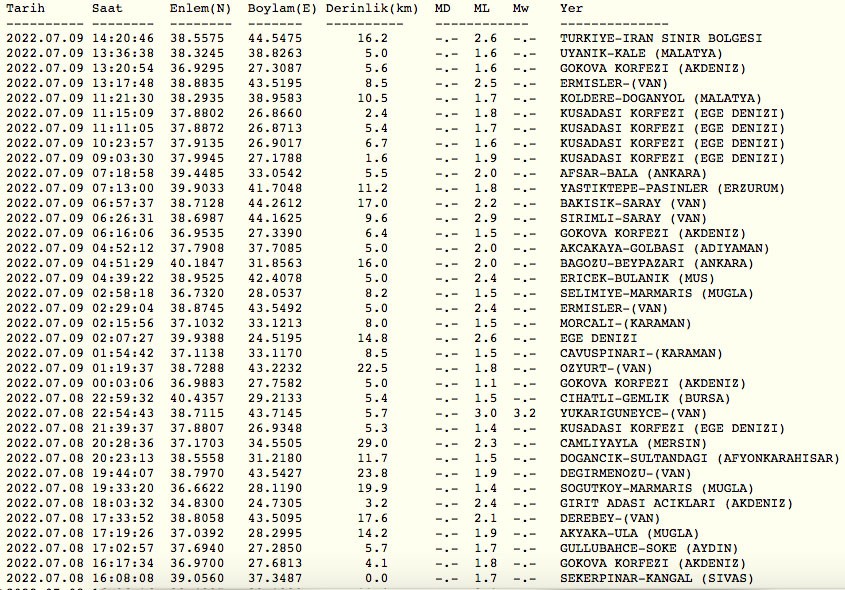 Kandilli Rasathanesi son depremler listesi
