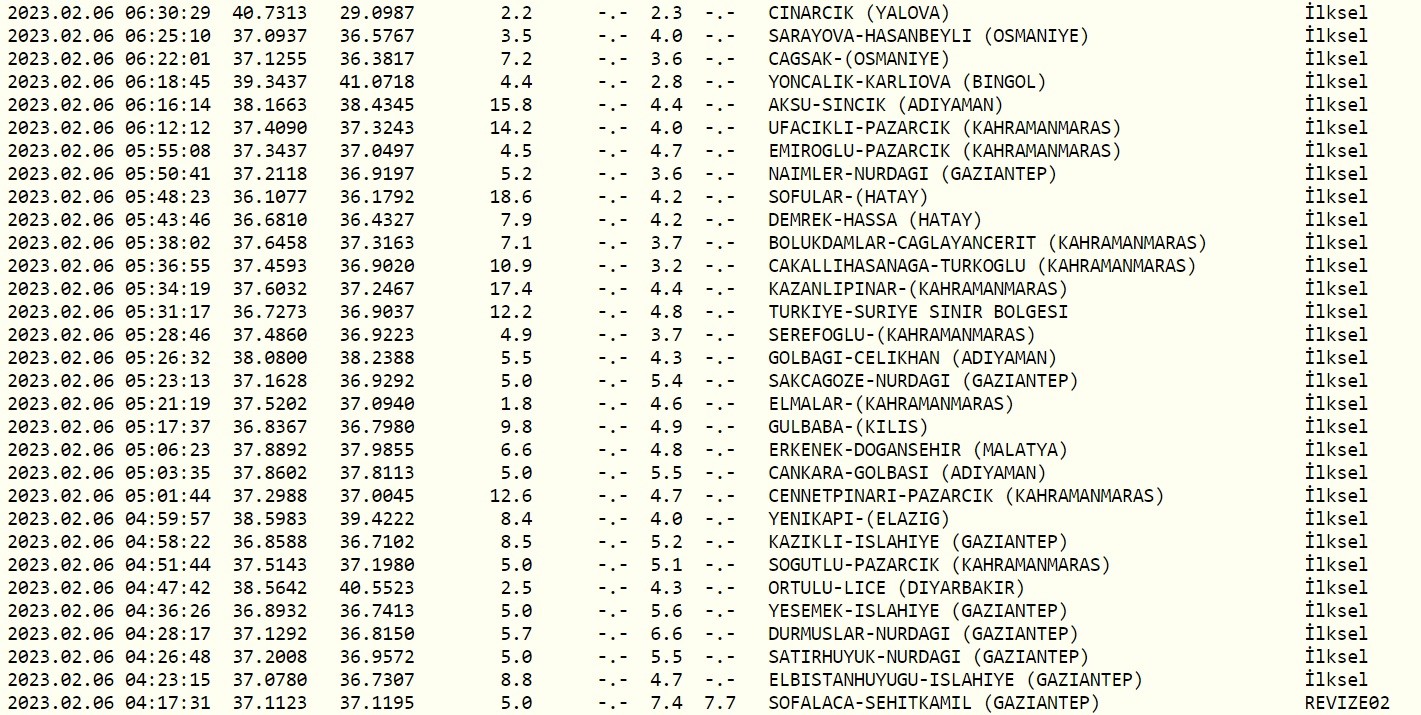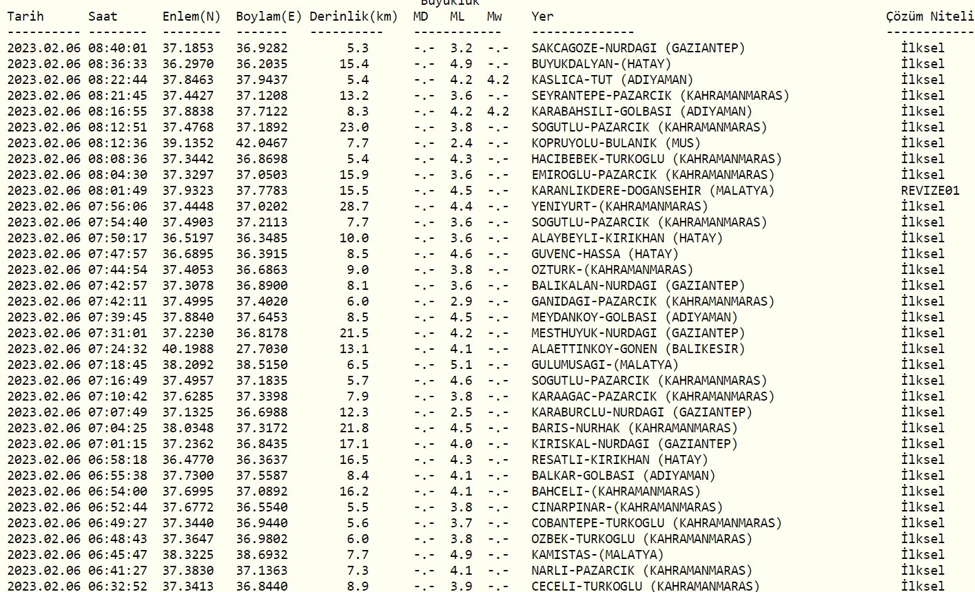 Türkiye 6 Şubat Pazartesi gününe büyük bir depremle uyandı. Kahramanmaraş Pazarcık merkezli 7.4'lük deprem 10 ili etkiledi. Şimdiye kadar 76 vatandaşın yaşamını yitirdiği resmi olarak açıklandı. AFAD yaşanan depremin ardından üçü 6'nın üzerinde olmak üzere toplam 66 artçının yaşandığını açıkladı.