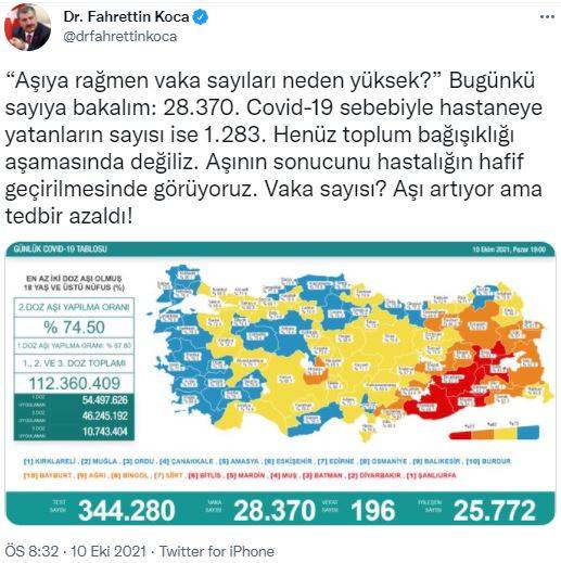 "Aşıya rağmen vaka sayıları neden yüksek? Bugünkü sayıya bakalım: 28 bin 370. Kovid-19 sebebiyle hastaneye yatanların sayısı ise 1283. Henüz toplum bağışıklığı aşamasında değiliz. Aşının sonucunu hastalığın hafif geçirilmesinde görüyoruz. Vaka sayısı? Aşı artıyor ama tedbir azaldı."