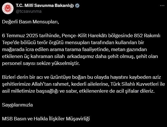 MSB: Pençe-Kilit Harekâtı bölgesinde 852 Rakımlı Tepe’de bölücü terör örgütü mensupları tarafından kullanılan bir mağarada icra edilen arama tarama faaliyetinde, metan gazından etkilenen üç kahraman silah arkadaşımız daha şehit olmuş, şehit olan personel sayısı sekize yükselmiştir.