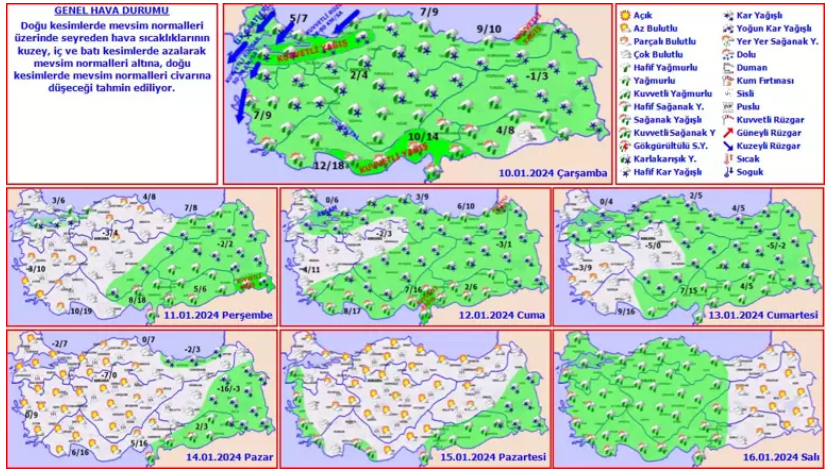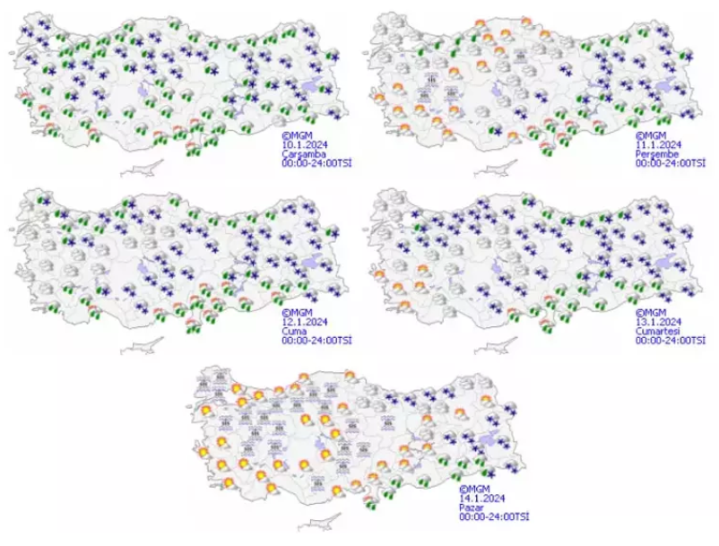 Yağışların Kuzey Ege kıyıları, Akdeniz, Karadeniz kıyıları, Güneydoğu Anadolu ile Malatya ve Elazığ çevrelerinde yağmur ve sağanak, yağış alan diğer yerlerde karla karışık yağmur ve kar şeklinde görülmesi bekleniyor. Yağışların Marmara'nın doğusunun yüksekleri, Doğu Akdeniz ile Çanakkale'nin doğusu, Balıkesir'in kuzeyi, Antalya'nın doğusu, Bolu ve Düzce'nin yüksekleri, Rize, Artvin, Kilis, Gaziantep ve Şanlıurfa çevrelerinde yerel olmak üzere kuvvetli olacağı tahmin ediliyor. Rüzgarın; Marmara’da kuzey ve kuzeydoğu yönlerden kuvvetli ve yer yer fırtına (50-90 km/saat) şeklinde esmesi bekleniyor. Doğu Karadeniz’in iç kesimleri ile Doğu Anadolu’nun doğusunda çığ tehlikesi bulunmaktadır.