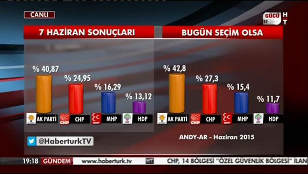 7 Haziran 2015 seçimlerini tam isabetle bilen Andy-Ar'ın son seçim anketine göre AK Parti'nin oyun yüzde 42.8'e yükseldi.