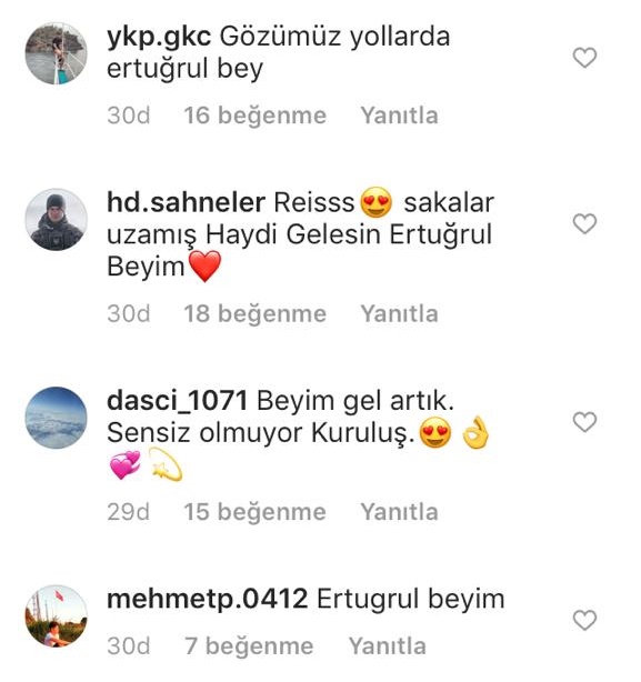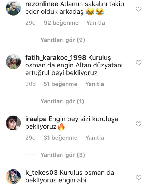 Engin Altan Düzyatan, bugün bir teknede çekilmiş fotoğrafını sosyal medya hesabından paylaştı. Fotoğrafta sakallarının uzadığını gören Kuruluş Osman hayranları paylaşımın altına çok sayıda yorum yaptı. Kullanıcılar, 'Engin bey sizi Kuruluş'a bekliyoruz', 'Kuruluş Osman'da bekliyoruz Engin abi', 'Gözümüz yollarda Ertuğrul bey', 'Haydi gelesin Ertuğrul beyim' yorumlarıyla Engin Altan Düzyatan'a çağrı yaptı.