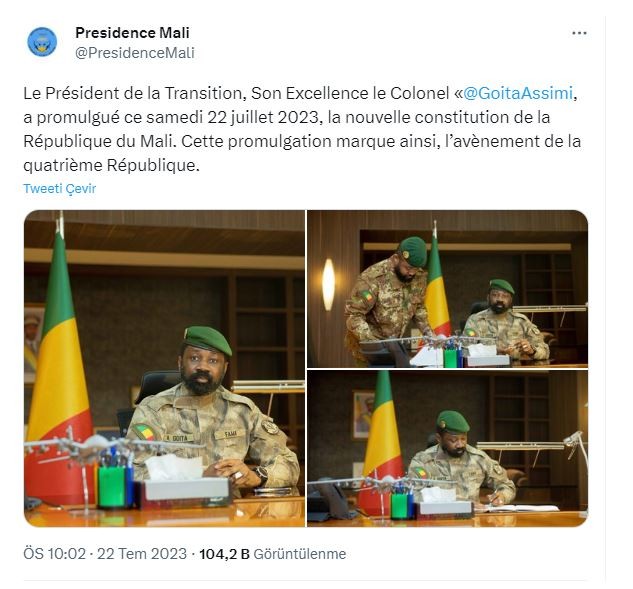 Mali, şimdi de yeni anayasasıyla birlikte Fransızcayı resmi dil olmaktan çıkardı. Mali Devlet Başkanı Albay Assimi Goita, ülkesinin yeni anayasasını, masasına Bayraktar Akıncı'nın maketini koyarak imzaladı.