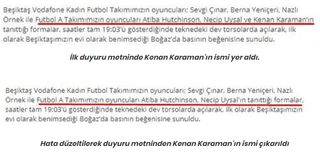 Beşiktaş yeni sezon formalarını tanıttı. Siyah-beyazlılar forma lansmanıyla ilgili yaptığı duyuruda yanlışlıkla Kenan Karaman transferini açıkladı. Hatasında kısa süre içinde dönen siyah-beyazlı kulüp duyuruda milli futbolcunun adını çıkarıp, sadece Atiba ve Necip'in ismini koydu.