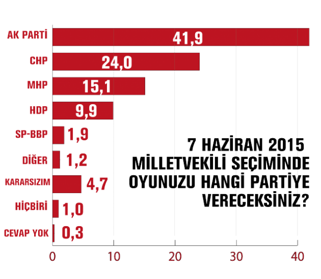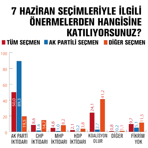 Buna karşın “7 Haziran seçimleriyle ilgili önermelerden hangisine katılıyorsunuz” sorusuna verilen tüm seçmenler arasında verilen cevapta “AK Parti yeniden tek başına iktidar olur” diyenlerin oranı yüzde 50. Diğer seçmenler arasında bu görüşe katılanlar ise yüzde 19.5. AK Parti’de bu oran yüzde 89.3.