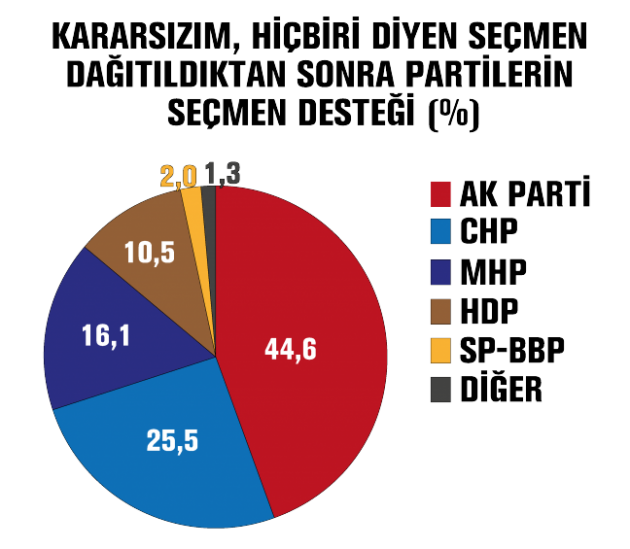 Araştırmada kararsızlar dağıtıldıktan sonra AK Parti’nin oyu yüzde 44.6. CHP yüzde 25.5, MHP 16.1. HDP ise yüzde 10.5.