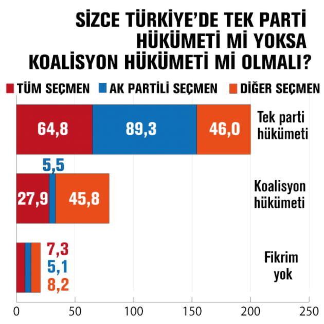 Koalisyon hükümeti isteyenler ise genel seçmen kitlesi içinde yüzde 27, AK Partililer arasında yüzde 5.5, diğer seçmenler arasında ise yüzde 45.8.