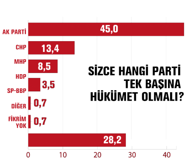 Tek parti hükümeti isteyen yüzde 64.8’lik kesimin “Sizce hangi parti tek başına hükümet olmalı” sorusuna verdiği cevap ise AK Parti’nin hala alternatifi olmadığını gösteriyor. AK Parti diyenlerin oranı yüzde 45. Bu oran kararsızlar dağıtıldığında AK Parti’nin aldığı oyu geçiyor.