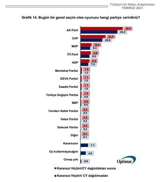 Optimar Araştırma, 10 Temmuz-13 Temmuz 2021 tarihleri arasında "Türkiye'nin Nabzı Temmuz Ayı Araştırması" ile 1726 kişi üzerinde yüz yüze görüşme yöntemiyle anket gerçekleştirdi.