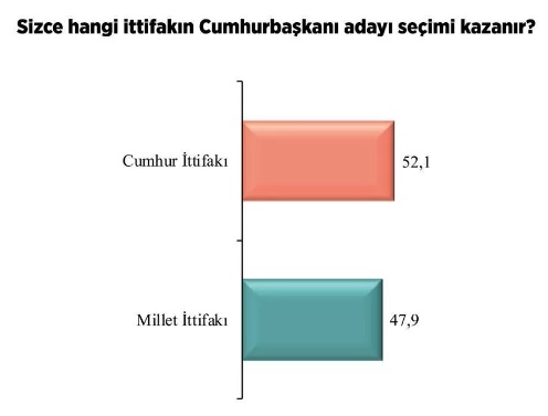 Her iki ittifak kıyaslandığında ise Cumhur ittifakının adayının, Millet İttifakı adayına göre önde olduğu görülüyor.