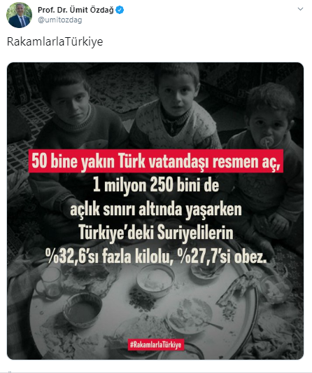 Ümit Özdağ, Kasım 2017’de attığı bir twitinde ise Türkiye'de yaşayan Suriyeli sığınmacıların 'yüzde 32.6'sının fazla kilolu, yüzde 27.7'sinin obez' olduğunu iddia etti. Özdağ, Türk vatandaşlarının 1 milyon 250 bininin açlık sınırı altında yaşadığını, buna karşın Suriyeli sığınmacıların yüzde 32.6'sının fazla kilolu, yüzde 27.7'sinin de obez olduğunu iddia ederek büyük bir insan hakları ihlali sergiledi.