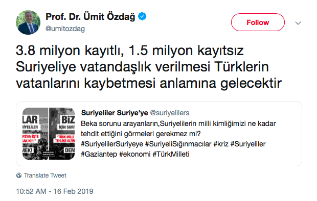 İP’li vekil Ümit Özdağ geçtiğimiz yılın Şubat ayında yaptığı bir Twitter paylaşımında ülkemizde bulunan 3.8 milyon Suriyeli sığınmacıya vatandaşlık verileceği iddiasında bulundu. Bu sayıdaki sığınmacıya vatandaşlık verilmesinin ülkedeki Türk varlığına zarar vereceğini ileri süren Özdağ uzun vadede vatanımızı kaybedebileceğimiz imasında bulundu.