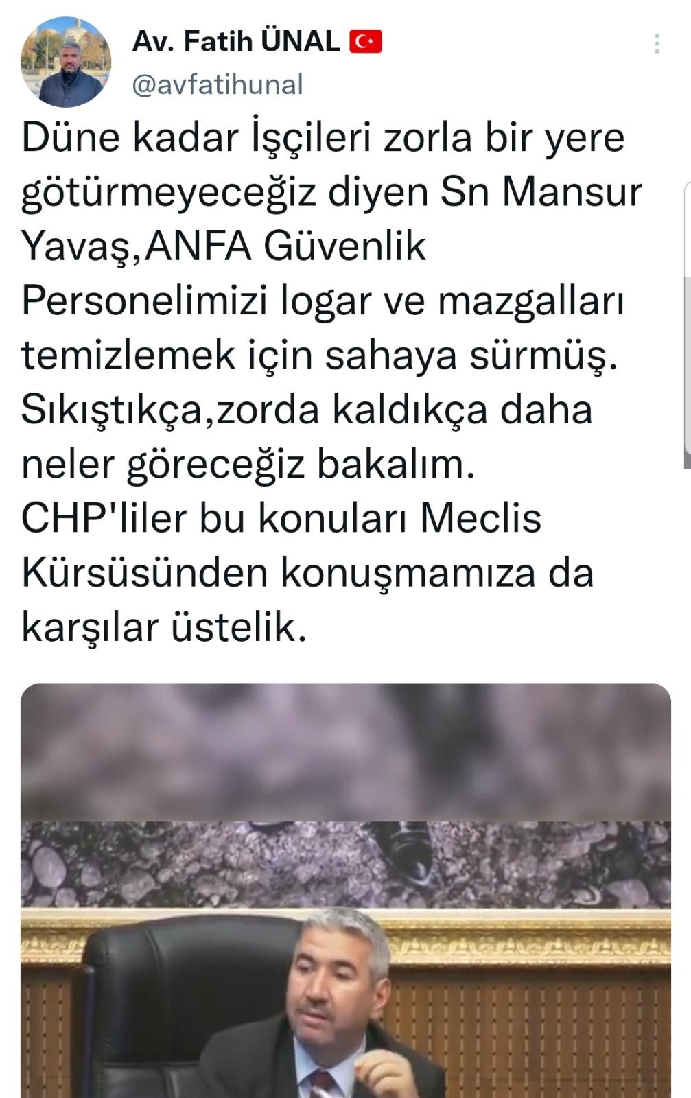 "Düne kadar İşçileri zorla bir yere götürmeyeceğiz diyen Sn Mansur Yavaş, ANFA Güvenlik Personelimizi logar ve mazgalları temizlemek için sahaya sürmüş. Sıkıştıkça, zorda kaldıkça daha neler göreceğiz bakalım. CHP'liler bu konuları Meclis Kürsüsünden konuşmamıza da karşılar üstelik."
