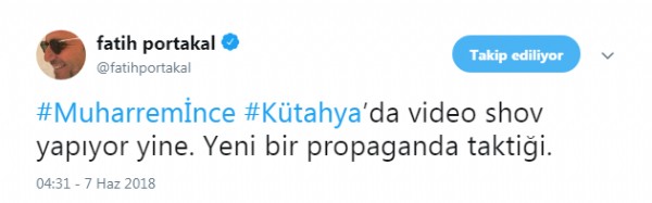 Portakal, Twitter hesabından yaptığı paylaşımda 'Muharrem İnce Kütahya'da video şov yapıyor' dedi ve ekledi: Yeni bir propaganda taktiği.'