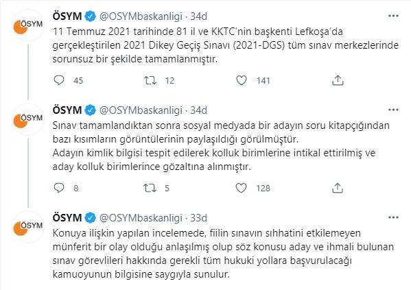 ÖSYM, dünkü DGS'de soruların bir kısmının görüntülerini sızdırılmasına ilişkin yazılı açıklama yaptı. Açıklamada, 11 Temmuz 2021 tarihinde 81 il ve KKTC’nin başkenti Lefkoşa’da gerçekleştirilen 2021 Dikey Geçiş Sınavının (2021-DGS) tüm sınav merkezlerinde sorunsuz bir şekilde tamamlandığı belirtilirken, soruların bir kısmının görüntülerini sızdıran şahsın yakalanarak gözaltına alındığı açıklandı.