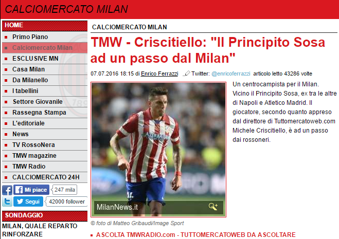 İtalya'nın tanınmış spor gazetecilerinden Michele Criscitiello'nun özel haberine göre Milan kulübü Beşiktaş'ın Arjantinli yıldızı Jose Sosa'yı transfer etmek için harekete geçti.