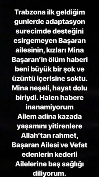 "Trabzon'a ilk geldiğim günlerde adaptasyon sürecimde desteğini esirgemeyen Başaran ailesinin kızları Mina Başaran'ın ölüm haberi beni büyük bir şok ve üzüntü içerisine soktu. Mina neşeli, hayat dolu biriydi. Halen habere inanamıyorum. Ailem adına kazada yaşamını yitirenlere Allah'tan rahmet, Başaran Ailesi ve vefat edenlerin kederli ailelerine baş sağlığı diliyorum."