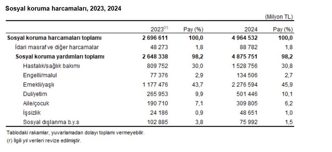 TÜİK, 2024 yılına ilişkin sosyal koruma istatistiklerini açıkladı. Buna göre; sosyal koruma harcaması 2024 yılında bir önceki yıla göre yüzde 84,1 artış göstererek 4 trilyon 964 milyar 532 milyon TL oldu. Bu harcamanın yüzde 98,2'sini 4 trilyon 875 milyar 751 milyon TL ile sosyal koruma yardımları oluşturdu. Sosyal koruma yardımlarında ise en büyük harcama 2 trilyon 276 milyar 594 milyon TL ile emekli/yaşlılara yapılan harcamalar oldu. Bunu 1 trilyon 528 milyar 756 milyon TL ile hastalık/sağlık bakımı harcamaları takip etti. Sosyal koruma harcamalarının gayrisafi yurt içi hasıla (GSYH) içindeki payı 2024 yılında yüzde 11,1 oldu. Sosyal koruma yardımlarının GSYH içindeki payı ise yüzde 10,9 olarak gerçekleşti. Risk/ihtiyaç grupları bazında bakıldığında, emekli/yaşlılara yapılan harcamaların yüzde 5,1 ile en büyük paya sahip olduğu görüldü. Bunu, yüzde 3,4 ile hastalık/sağlık bakımı harcamaları ve yüzde 1,1 ile dul/yetim harcamaları takip etti.