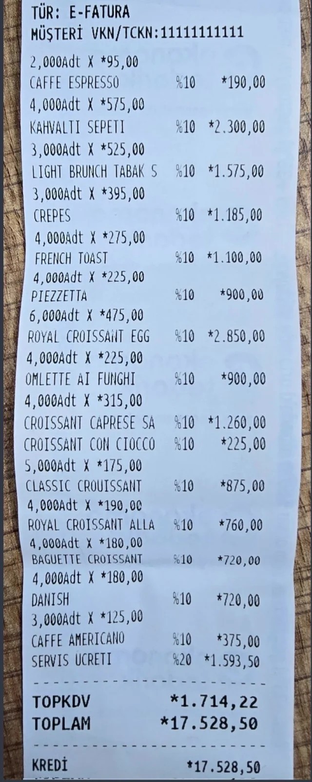 Gündem olan menüdeki fiyat listesine göre; bir Americano 125 TL, espresso 95 TL, klasik kruvasan ise 175 TL’den satışa sunuluyor. Kahvaltı kategorisinde yer alan omlet için 225 TL, kahvaltı sepeti için 575 TL ve brunch tabağı için 525 TL talep ediliyor. Ayrıca, toplam hesap üzerinden alınan yüzde 10 servis ücreti de dikkat çeken başlıklar arasında yer aldı.