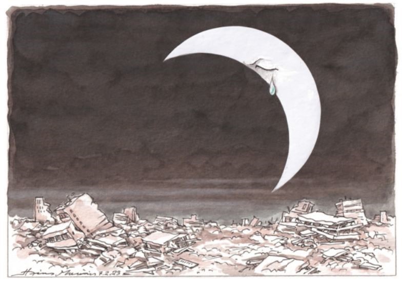 Yunan karikatürist Ilias Makris’in deprem çizimi sosyal medyada gündem oldu. Makris, Kathimerini gazetesindeki çiziminde gökyüzünde hilal biçimindeki ayın gözünden yıkılan binaların üzerine doğru bir damla yaş damladığını resmetti.