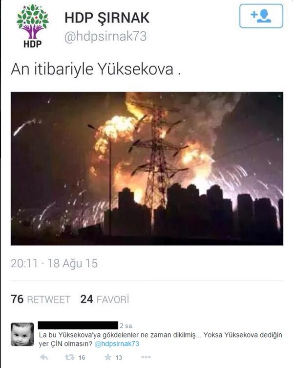 Nusaybin üzerinden yapılan algı operasyonu, akıllara daha önce Çin'de meydana gelen patlamanın fotoğrafını "An itibariyle Yüksekova" başlığıyla paylaşan kullanıcıları getirdi. O provokatörler böyle alay konusu olmuştu: