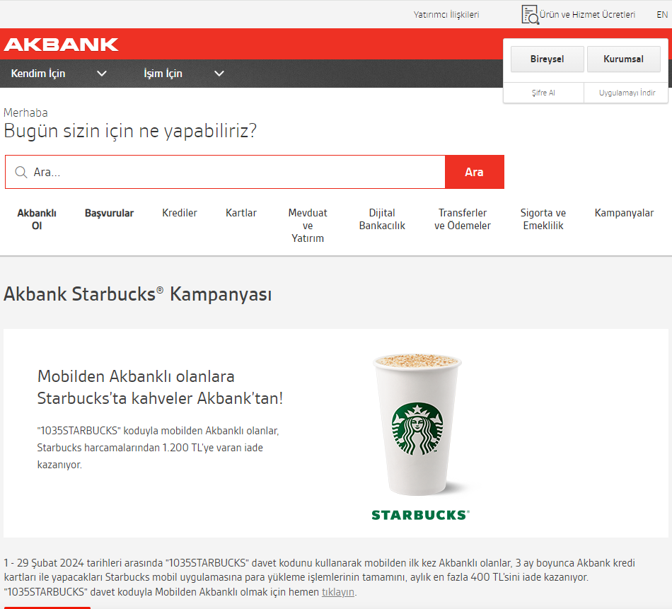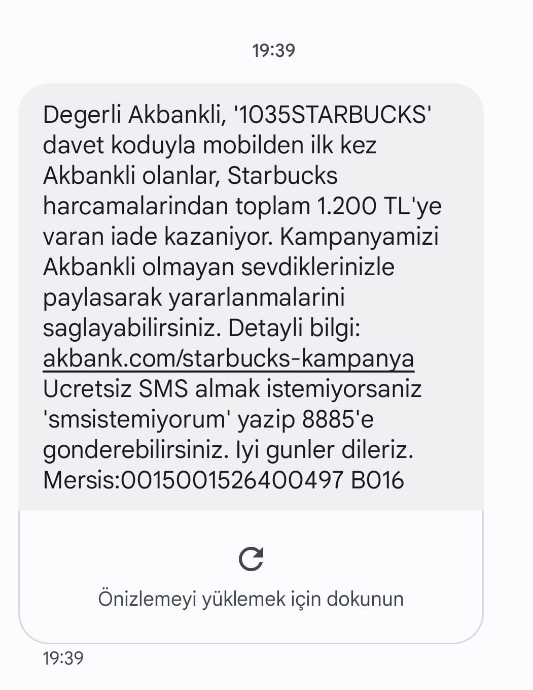 "1035STARBUCKS' davet kodunu kullanarak mobilden ilk kez Akbanklı olanlar, Starbucks harcamalarında toplam 1.200 TL'ye varan iade kazanıyor."