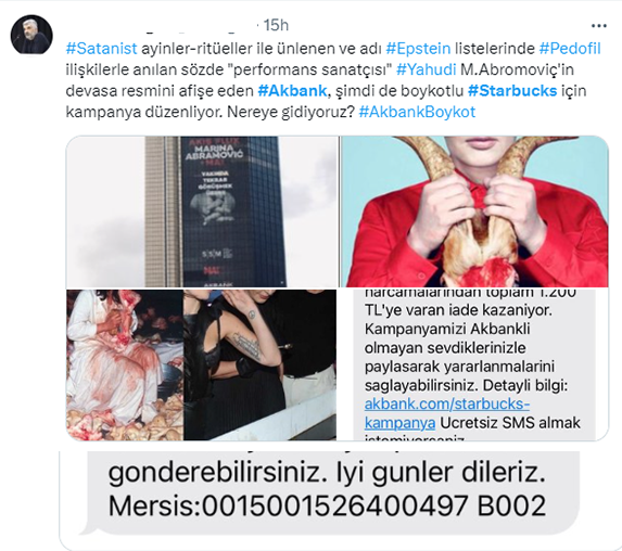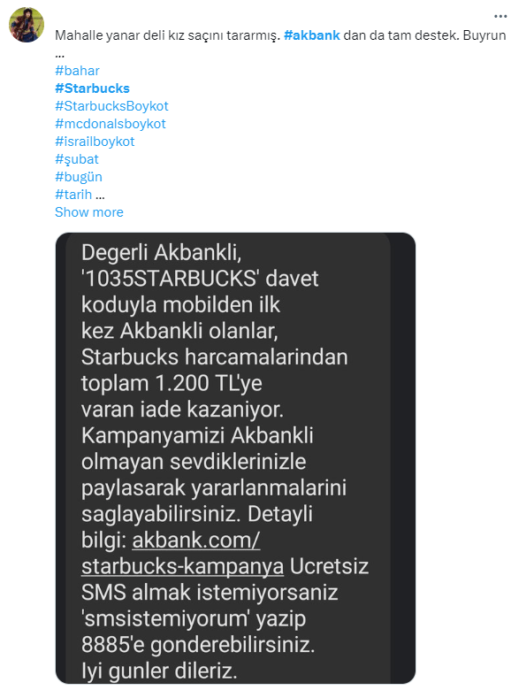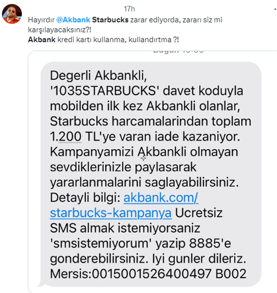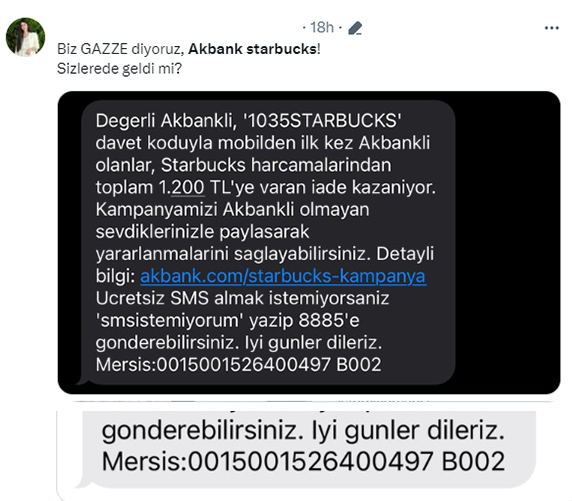 Banka müşterilerine attığı mesajla, insanlık suçu işleyen Starbucks'la yaptığı işbirliğini 'kampanya' adı altında sundu. Mesajda şu ifadeler yer aldı: