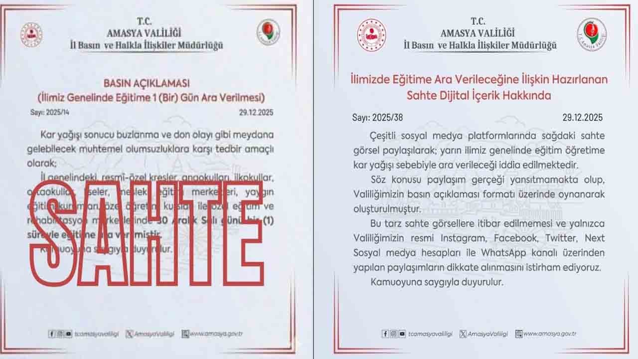 Bugün eğitime ara verileceği öne sürülen sahte görsellere itibar edilmemesi gerektiği de vurgulanarak, yalnızca Amasya Valiliği’nin resmi sanal medya hesapları ile WhatsApp kanalı üzerinden yapılan duyuruların dikkate alınması gerektiği belirtildi.