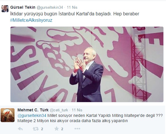 YENİAKİT.COM.TR - CHP'nin hüsranla sonuçlanan Kartal mitingi için "İktidar yürüyüşü bugün İstanbul Kartal'da başladı. Hep beraber milletçe alkışlıyoruz" yorumunda bulunan CHP Genel Sekreteri Gürsel Tekin'e bir sosyal medya kullanıcısından zor bir soru yöneltildi. @ceti_turk isimli bir kullanıcı, "Millet soruyor neden Kartal'da yapıldı miting, Maltepe'de değil? Maltepe'ye 2 milyon kişi akıyor, orada daha fazla alkış yapardın" diyerek Tekin'i köşeye sıkıştırdı.