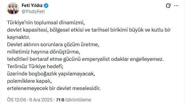 MHP Genel Başkan Yardımcısı Feti Yıldız, sosyal medya hesabından yaptığı açıklamada, "Türkiye'nin toplumsal dinamizmi, devlet kapasitesi, bölgesel etkisi ve tarihsel birikimi büyük ve kutlu bir kaynaktır. Devlet aklının sorunlara çözüm üretme, milletimiz hayrına dönüştürme, tehditleri bertaraf etme gücünü emperyalist odaklar engelleyemez. 'Terörsüz Türkiye' hedefi; üzerinde boşboğazlık yapılamayacak, polemiklere kapalı, ertelenemeyecek bir devlet meselesidir" ifadelerini kullandı. (DHA)