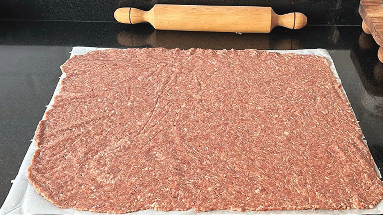 Her parçayı iki yağlı kağıdın arasına koyun ve oklava ile çok ince olacak şekilde açın. (İnce açılmazsa köfte kıvamında kalır.)