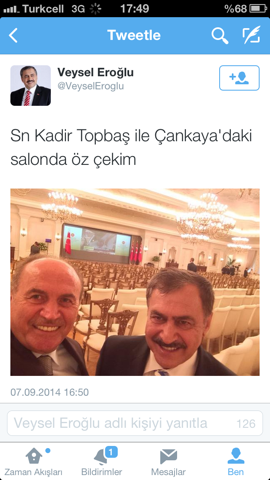 Orman ve Su İşleri Bakanı Veysel Eroğlu, Twitter hesabından Topbaş'la birlikte çektiği "selfie"yi paylaşarak "Sn Kadir Topbaş ile Çankaya'daki salonda öz çekim" diye yazdı.