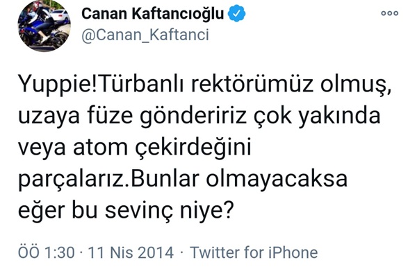 "Yuppie! Türbanlı rektörümüz olmuş, uzaya füze göndeririz çok yakında veya atom çekirdeğini parçalarız. Bunlar olmayacaksa eğer bu sevinç niye?"