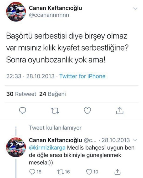 Başörtüsü ve kadın savunuculuğu yapmaya kalkışan Canan Kaftancıoğlu'nun eski tweetlerinde, şu skandal ifadeleri kullandığı görüldü: