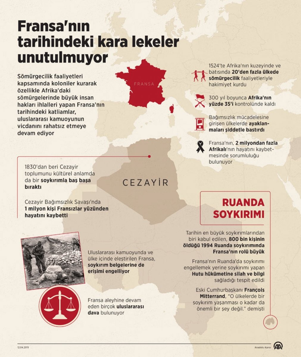 Sömürgecilik faaliyetleri kapsamında koloniler kurarak özellikle Afrika'daki sömürgelerinde büyük insan hakları ihlalleri yapan ve sözde 'Ermeni soykırımı' ile geçmişte yaptıklarını unutturmaya çalışan Fransa'nın tarihindeki katliamlar, uluslararası kamuoyunun vicdanını rahatsız etmeye devam ediyor.