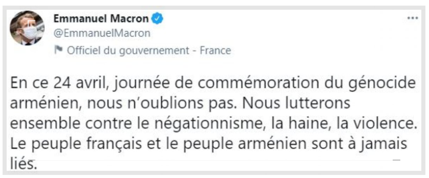 "24 Nisan 'Ermeni Soykırımı' anma gününü unutmayacağız. İnkarcılığa, nefrete, şiddete karşı birlikte savaşacağız. Fransız halkı ve Ermeni halkı sonsuza dek birbirine bağlıdır."